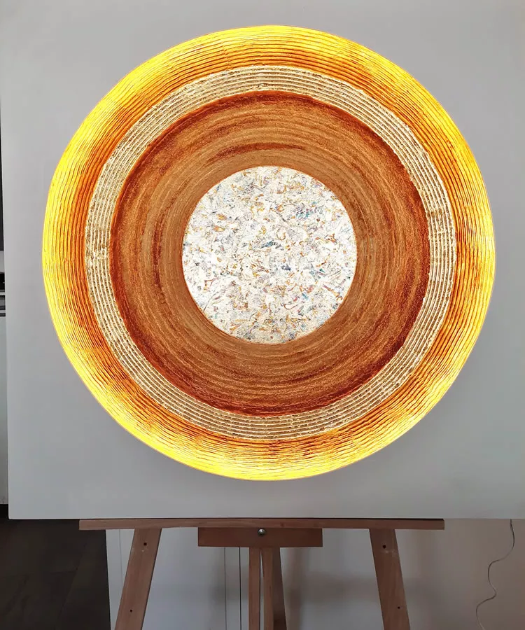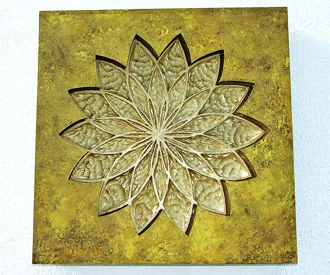 Ob zum Beispiel geometrische Kreisform als Symbol für Harmonie und Vollkommenheit oder die Umsetzung von Lebenssymbolen in Mandalas mit kräftigen Farbkontrasten versetzt mit Halbedelsteinen wie Bergkristall, Rosenquarz oder Amethyst. Dabei verwenden wir 24 Karat Gold mit Schlagmetall Gold gemischt. Gold hat die Ausstrahlung von Wärme, Kraft und Dauerhaftigkeit. Gold erhöht das Energiefeld in Räumlichkeiten.
